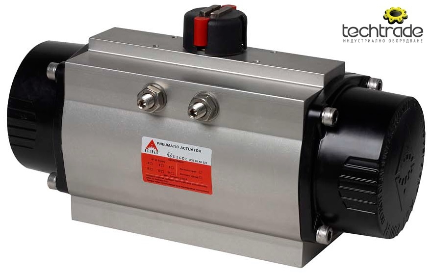 Пневматична задвижка с единично действие (въздух/пружина), четвъртоборотна, производител ACTREG, модел ASR80, с индикатор за позиция, тяло, бутала, капачки: алуминий закален, вътрешни части – неръждаема стомана, алуминий, уплътнения NBR, настройка на завъ