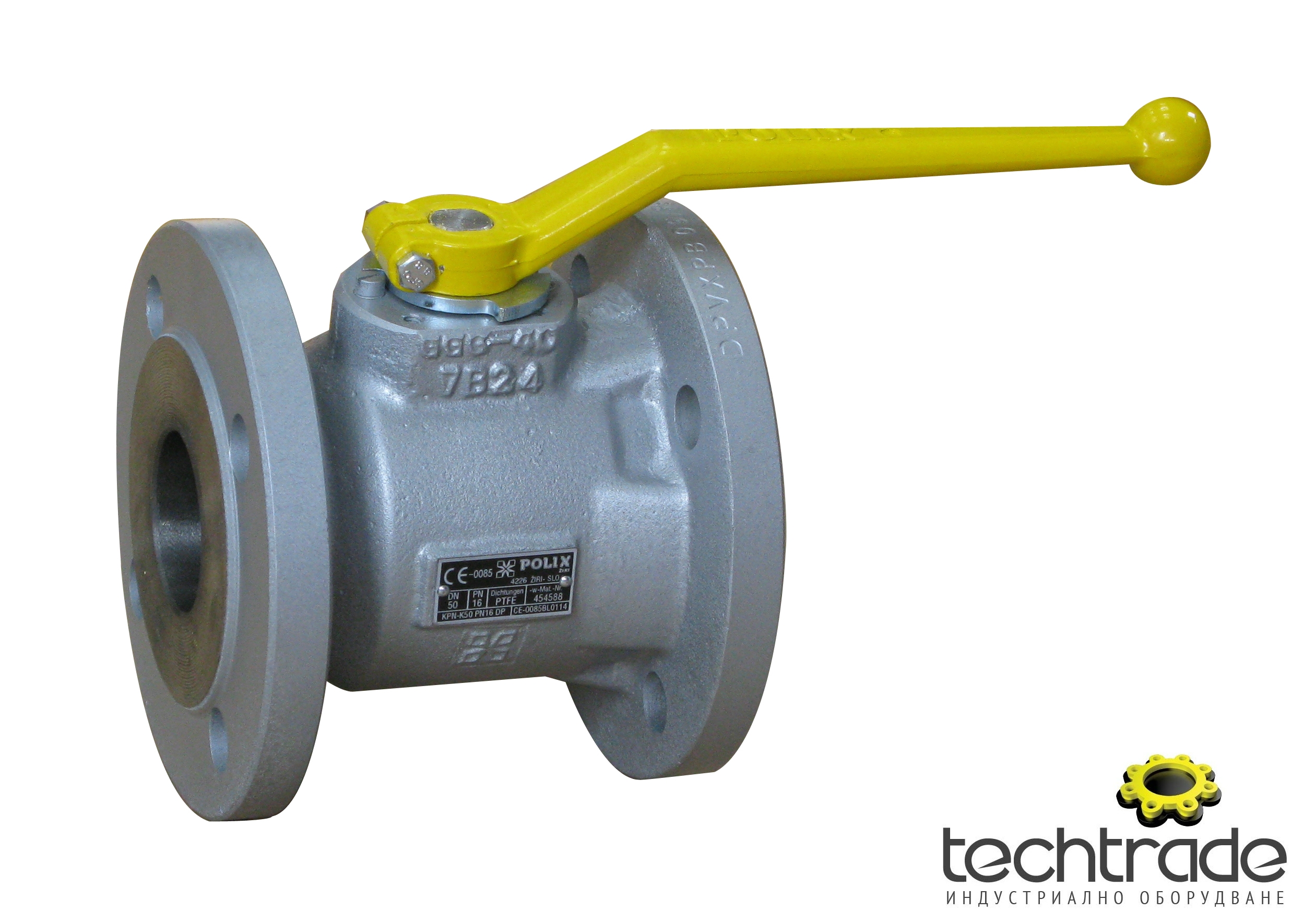 Сферичен кран за газ, чугун, на фланци, ръчен, производител POLIX, модел KPN-G, корпус – сферографитен чугун GGG40, сфера – неръждаема стомана – AISI304, шпиндел – неръждаема стомана – AISI420, уплътнение сфера – тефлон (PTFE), уплътнение шпиндел – VITON,