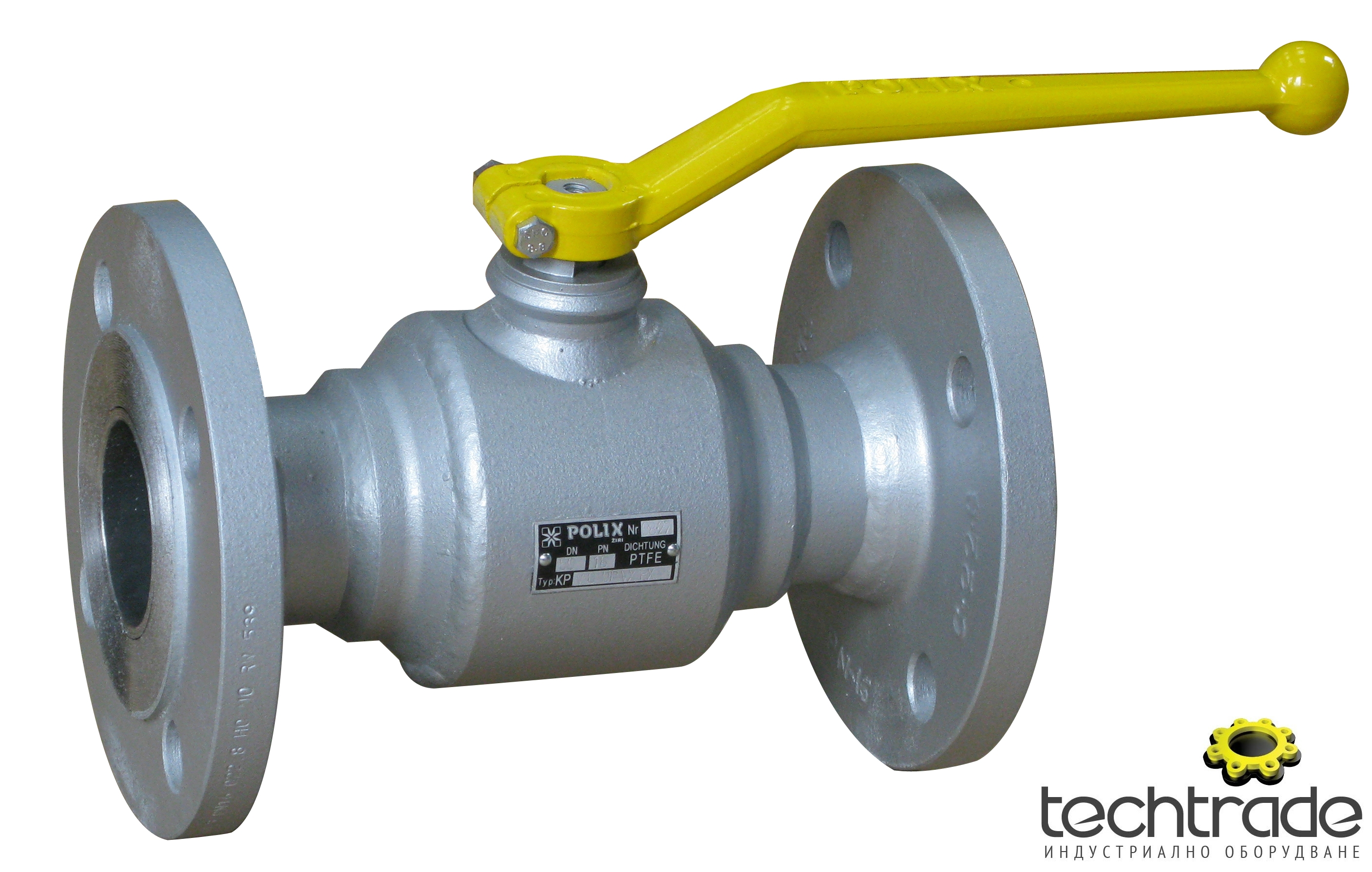 Сферичен кран за газ, стомана, на фланци, ръчен, производител POLIX, модел KPV-G, тяло- въглеродна стомана St 52-3, сфера - неръждаема стомана, шпиндел - неръждаема стомана, уплътнение сфера – тефлон (PTFE), уплътнение шпиндел – VITON, температурен диапазон -20 ° ÷ +60°С, клас на налягане PN16, размери DN25÷DN250